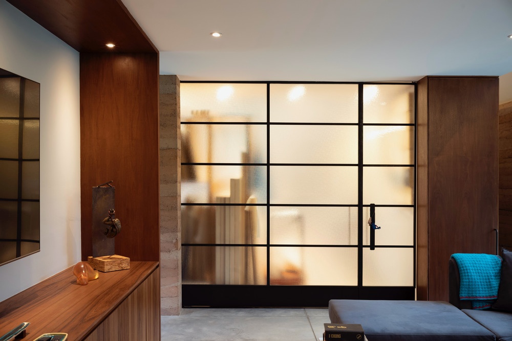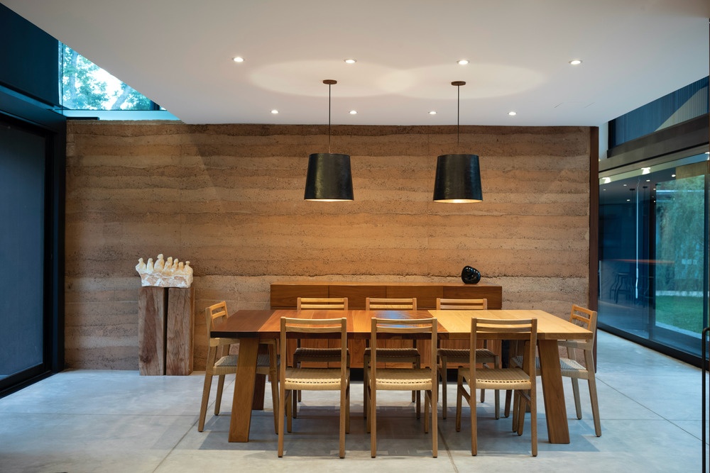A entrada principal se abre para uma espaçosa sala de estar com lareira, piano e área para refeições. Adjacente à área de jantar, um volume de taipa, ou tapia, enquadra uma despensa, lavanderia e banheiro de hóspedes, dividindo a sala principal e área de jantar da cozinha e sala da família.