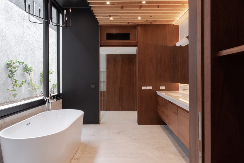 Buscando o equilíbrio entre as vistas inspiradoras e a privacidade do cliente, o arquiteto Alvaro Moragrega projetou um esquema em L, com o volume principal da residência, envolto em aço e vidro, servindo como uma barreira entre as áreas privadas da residência e o campo de golfe adjacente. O volume, que apresenta um telhado inclinado com telhas pretas planas, foi projetado na imagem de uma ‘cabana de espingarda’, ou uma distribuição alongada de espaços que vão do público ao privado.
