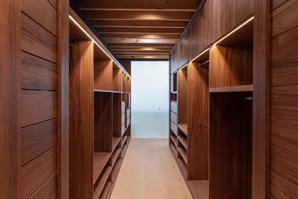 Logo após o volume de taipa uma estrutura personalizada abriga parte da cozinha, além de uma estante de livros com TV e um pequeno fogão, bloqueando as vistas do campo de golfe e reorientando-as para o jardim e a piscina. Um recinto abriga a área de armazenamento, servindo duplamente para desviar a vista da área do jardim.